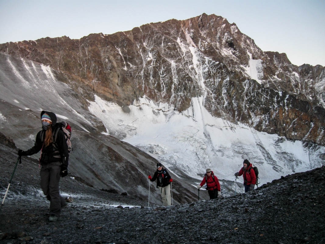 Nos levantamos temprano para desayunar y armar las mochilas. Desde aquí la marcha hasta el campo siguiente será con poco peso ya que la carga será llevada por mulas que contrataremos en el lugar. Aconsejamos esta opción, ya que llevar nuestro equipo personal, y además, las carpas, los elementos de cocina y la comida por el resto de los días de la expedición, es sumamente cansador y desgastante físicamente. Este es un día exigente porque deberemos sumar 1300 metros de desnivel positivo, y dormir esa noche a 4200 msnm, lo cual puede traer algunos malestares y síntomas de mal de altura, a los que hay que estar muy atentos para saber cómo va nuestra aclimatación.